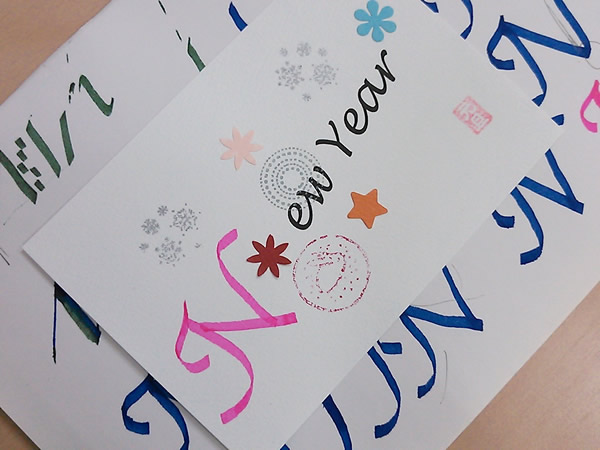 予めポストカードに「ew Year」と印刷しておき、イタリック体の「N」を練習していただいて清書していただく、というもの。マーカーは少し扱いづらいところもありますが、みなさんきれいに書かれていました。