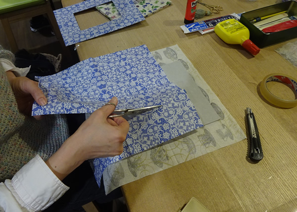 次に蛇腹カードに仕立てます。ナガサワさんよりRossiのプリントペーパーをご提供いただきました。テンションあがりますね。