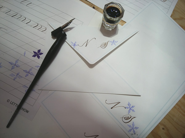 ペン先の用意ができたら基本ストロークから練習です。ポインテッドペンは本当に難しいですね。綺麗な線はなかなか出ません。でも、いくつかのストロークを重ねていき「Thank you」を何回も書いていくと、だんだんといい線の出る部分が増えてきます。